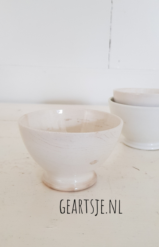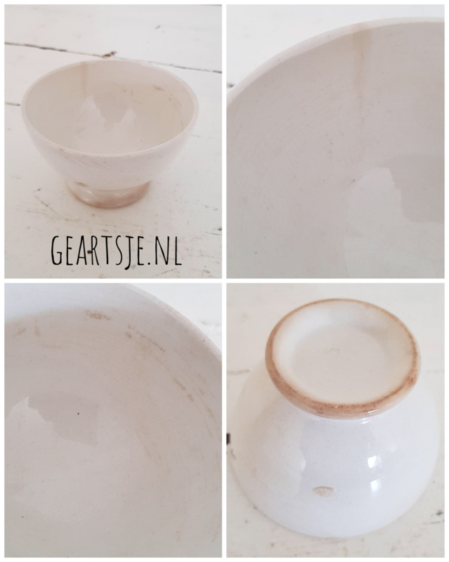 De kom heeft een beboterd haarlijntje. Beboterde verkleuringen van het glazuur. En een klein bakfoutje aan een kant.